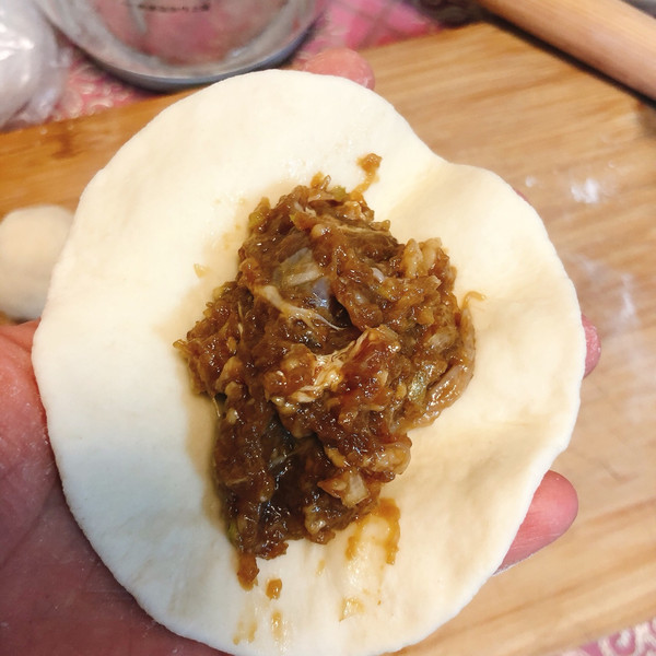 擀面杖擀薄,中间稍微厚点,周围薄一点,放入馅料