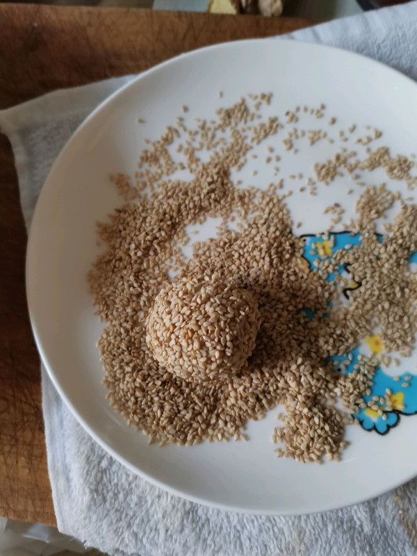 将醒发好的面团分成若干个小挤子,揉圆,表面沾一点水然后裹上芝麻(沾水是为了让芝麻不容易脱落)