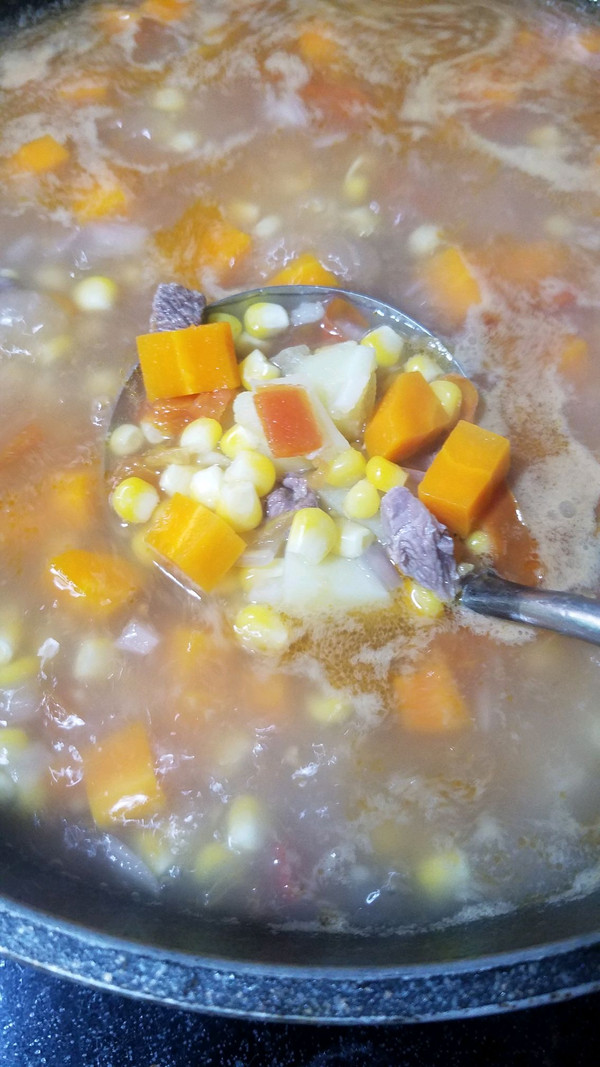 最后倒入玉米,牛肉,再煮10分钟加入调味料即可。