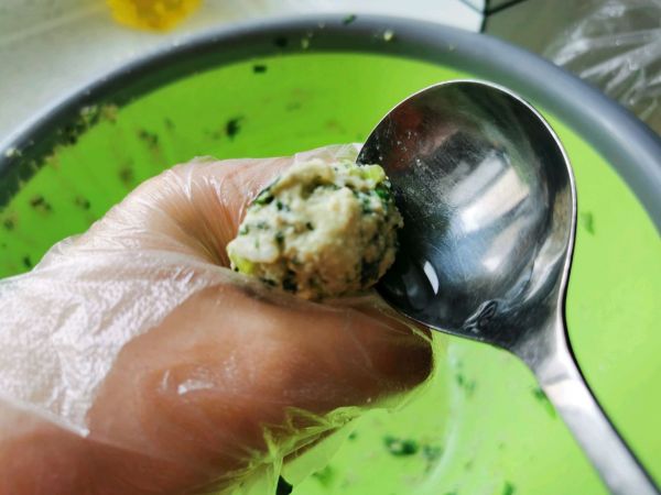 虎口处轻轻挤出,勺子在油锅中沾点油,防止粘