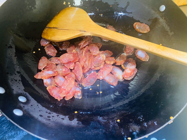 锅内放少许油,将腊肠煎出油后捞出备用。