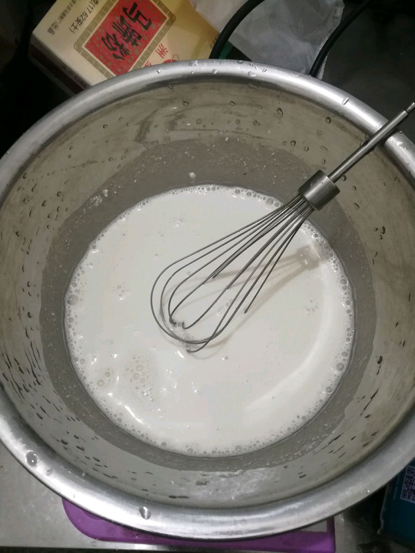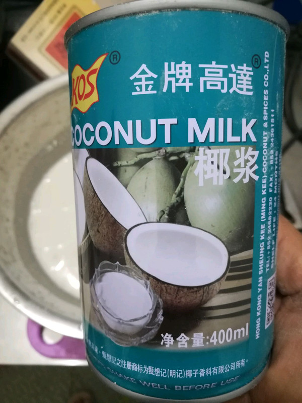 现在又做椰浆部分(小白):125g马蹄粉加入200g水搅拌均匀。然后加入400g椰浆和100g纯牛奶。(椰浆罐上面开两个小口就容易倒出来)