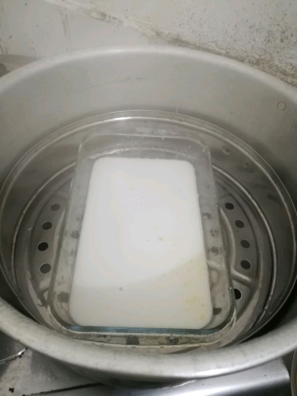找个平底容器,底部抹些植物油,这样方便脱模。因为蒸的时间过长,所以锅里的水要多些,以免糊锅。