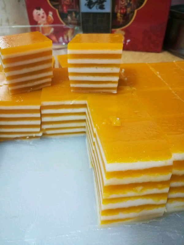 尽量用同款汤勺两个,每种浆专用一个勺子,按照勺子的大小舀浆糊的量一样,如小黄舀3勺、小白就舀3勺地交替铺开,一层小黄一层小白,如此重复间隔,直到两种粉浆用完为止。这样就保证每层层次均匀,每次舀粉浆前先搅拌一下。每层蒸3到5分钟,蒸至表面凝固。每次都要盖上锅盖。到最后一层蒸上10分钟。