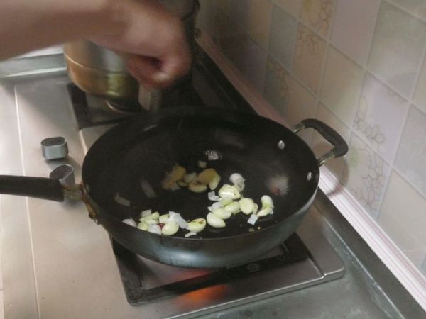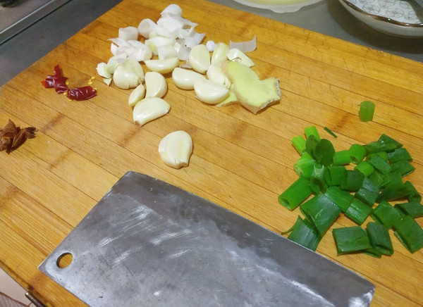 起锅烧油,放葱、姜、蒜、干辣椒、大料爆香。