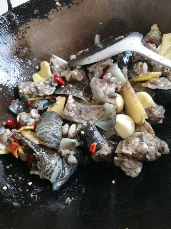 甲鱼杀掉,处理干净,切小块焯水。我买的甲鱼是一斤一只的,所以用了两只