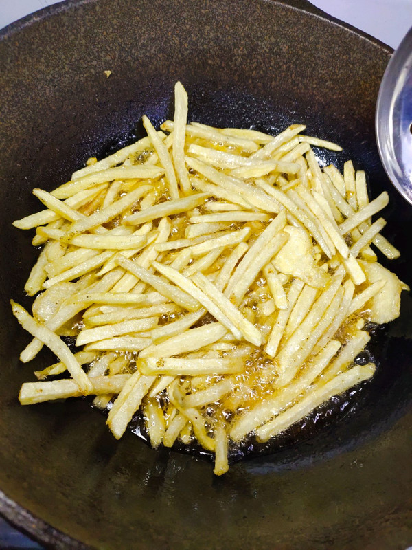油烧热再倒入土豆复炸一次,炸至颜色金黄。