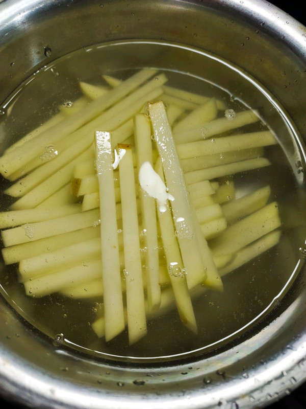 切成长条,放入泠水中浸泡。