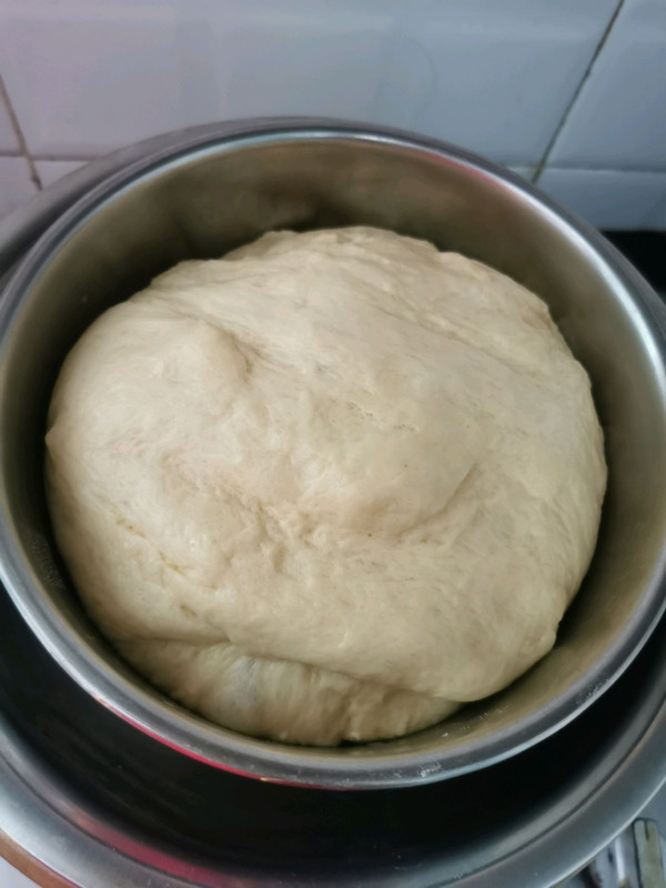 将面团擀成长条卷起放到土司盒里,放到烤箱不关盖子放一碗水进行发酵