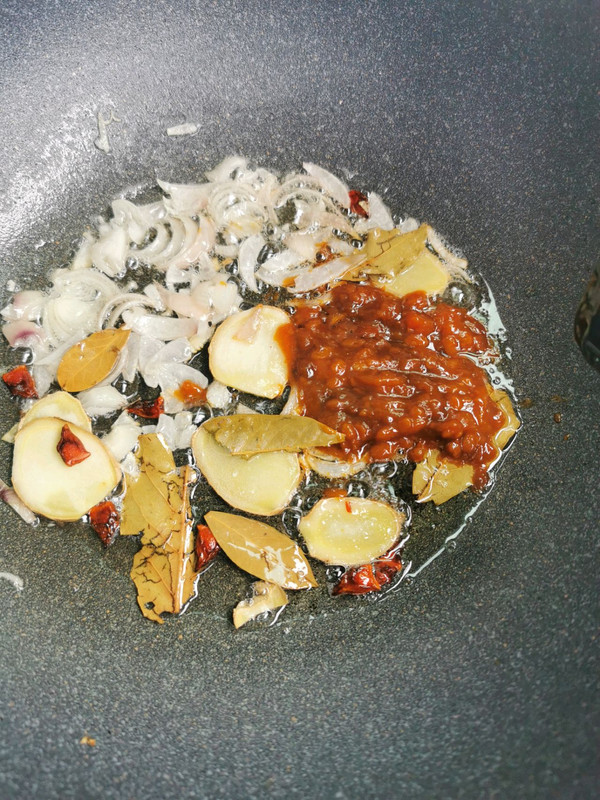 热锅少油,加上上图盆里的调料,陈皮除外,陈皮后放。