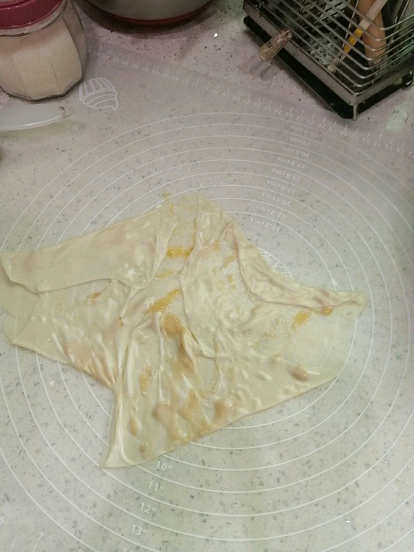 尽量擀薄点,抹上一层香蕉泥。香蕉直接压成泥就可以了