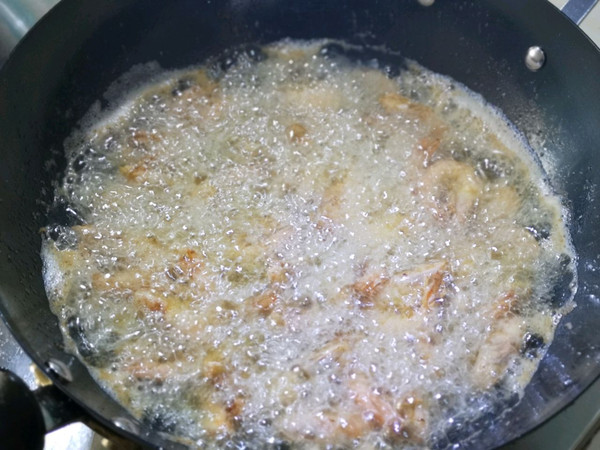 油继续加热升温至200℃左右复炸30秒,虾壳变脆