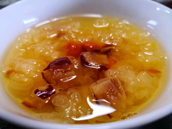 大火十分钟后,用勺子快速搅拌30秒,这也是银耳快速出胶的秘诀所在。