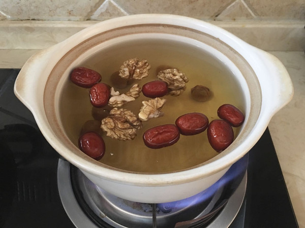 取一口砂锅把洗好的红枣桂圆核桃放进去,加入纯净水。核桃泡一晚更容易煮熟哦,不然太干了很硬的