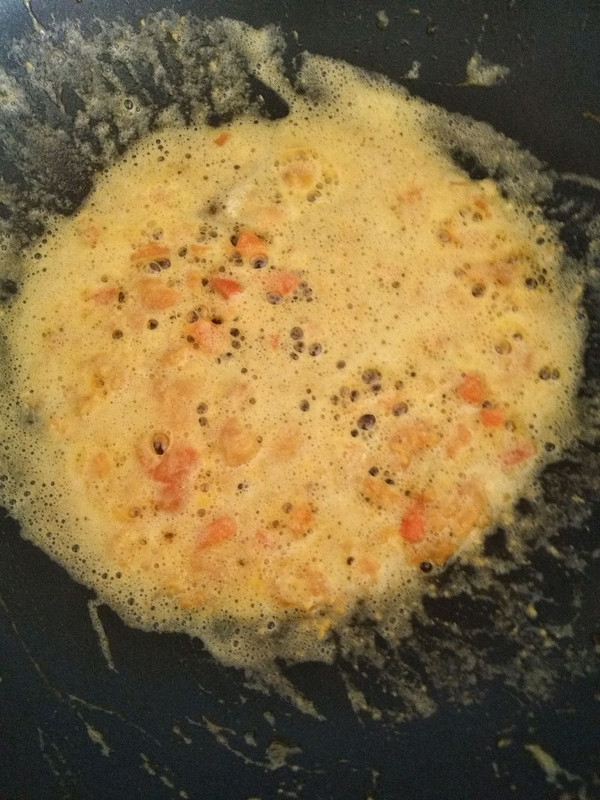 蛋黄先滴白酒去腥,入空气炸锅160度5分钟,表面有油后拍散,因为上次不经过这一步直接切丁炒不易炒散。另起一锅加少量油炒开蛋黄,遇热它就起泡,随手切了点胡萝卜丁,可以根据个人喜好添加。在上一步也可添加。