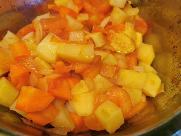 土豆两个,胡萝卜一根,切成小块备用,过水再沥干水分,这样淀粉就没那么多了
