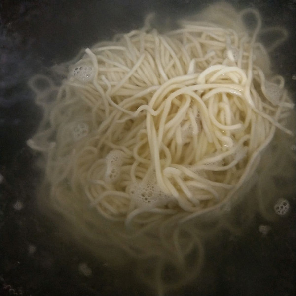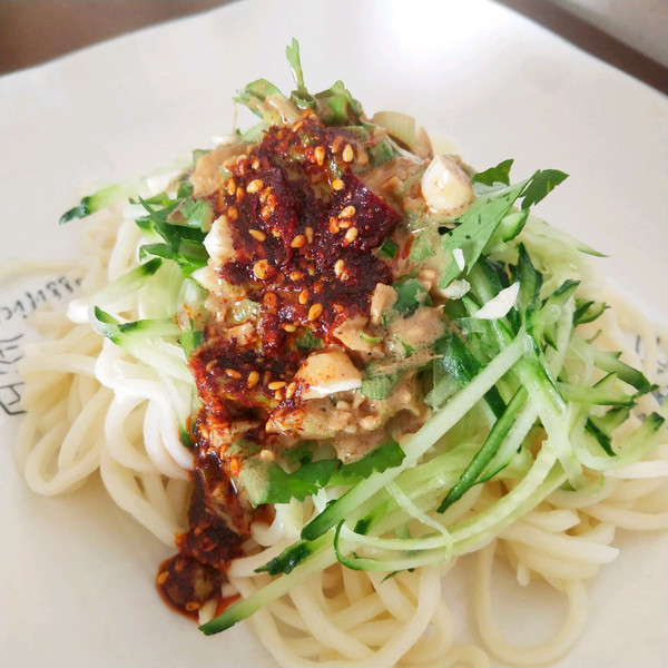 将控好水的面条放入盘中。依次加入黄瓜丝香菜末,蒜末,酱汁和辣椒油拌匀即可