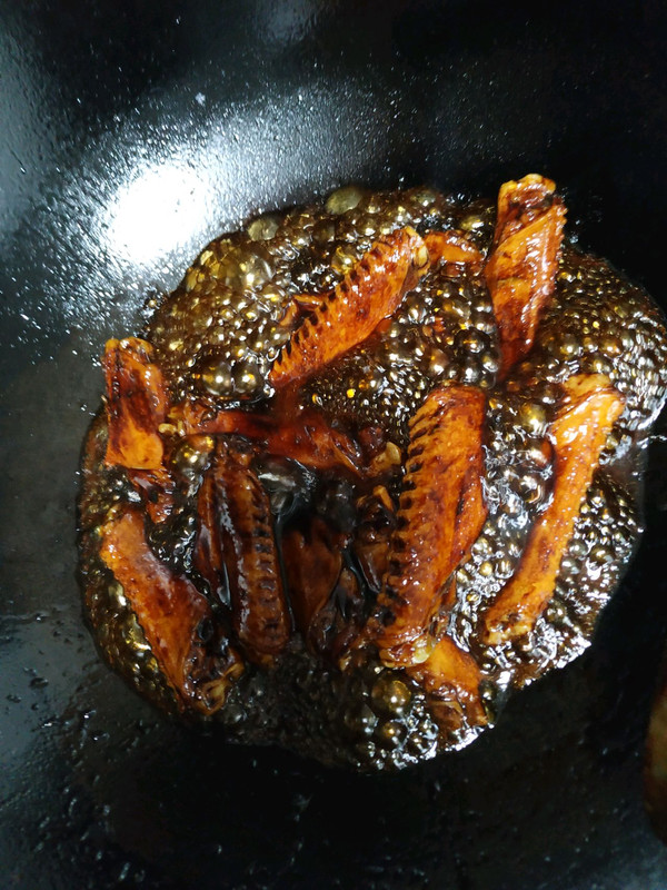起锅烧油,又热下鸭翅煸炒,依次下入老抽,生抽,料酒。(这里我用的锅铲乘的调料,大概就是一锅铲每种)继续翻炒三分钟