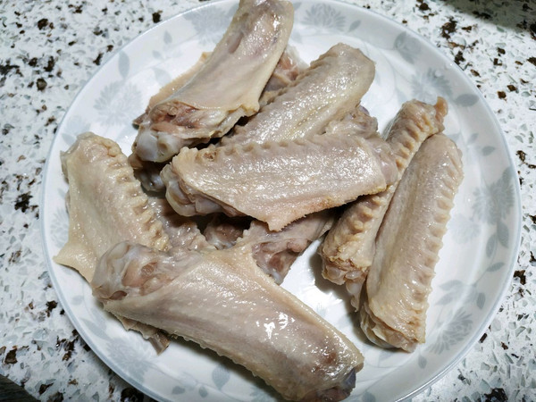 鸭中翅洗净,放入锅里加冷水,一大勺料酒,焯去血水,沥干备用