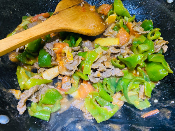 加入螺丝椒和洋葱继续翻炒,放生抽和盐调味。