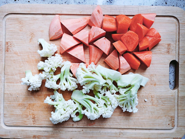 开盖,红薯和胡萝卜都已经熟了,稍稍翻拌一下。