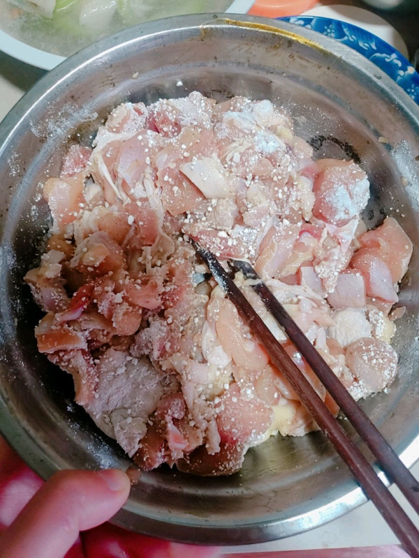 鸡腿肉放入20克红薯淀粉抓拌均匀