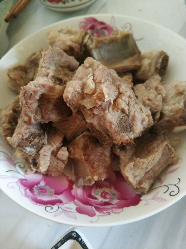 倒入清水,沒过排骨,倒入料酒,大火炖。水开后,中小火炖30分钟左右。期间注意水别糊锅。