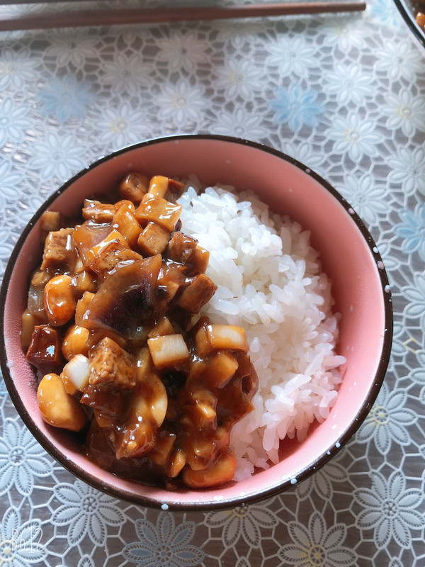 开盖,加入花生米,把淀粉加水调一下,一手拿铲子,一手慢慢倒淀粉水,翻至浓稠成酱即可出锅!