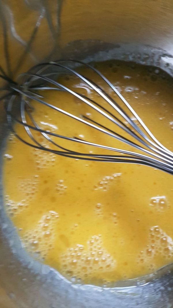 再将蛋黄糊全部倒入蛋白中,用刮刀翻拌均匀