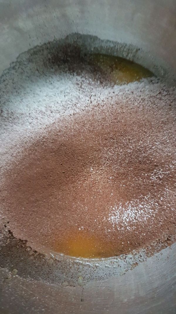 蛋黄液中筛入低筋面粉 可可粉 用手动打蛋器搅拌均匀