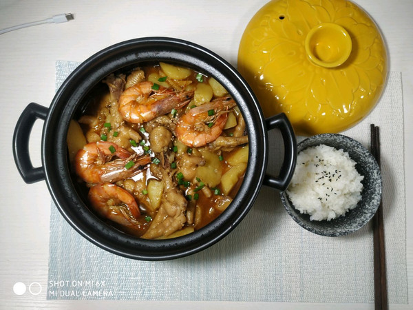 放入土豆块,大虾,土豆软烂之后,撒入水淀粉少许,大火收汁,水不够中途可以加热水