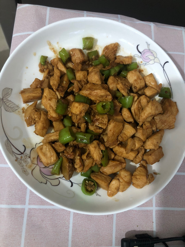 等待油热后,把腌制好的鸡胸肉倒入锅中翻炒