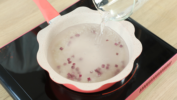 奶锅中倒入洗净的大米,紫薯丁和600毫升清水,大火煮40分钟。