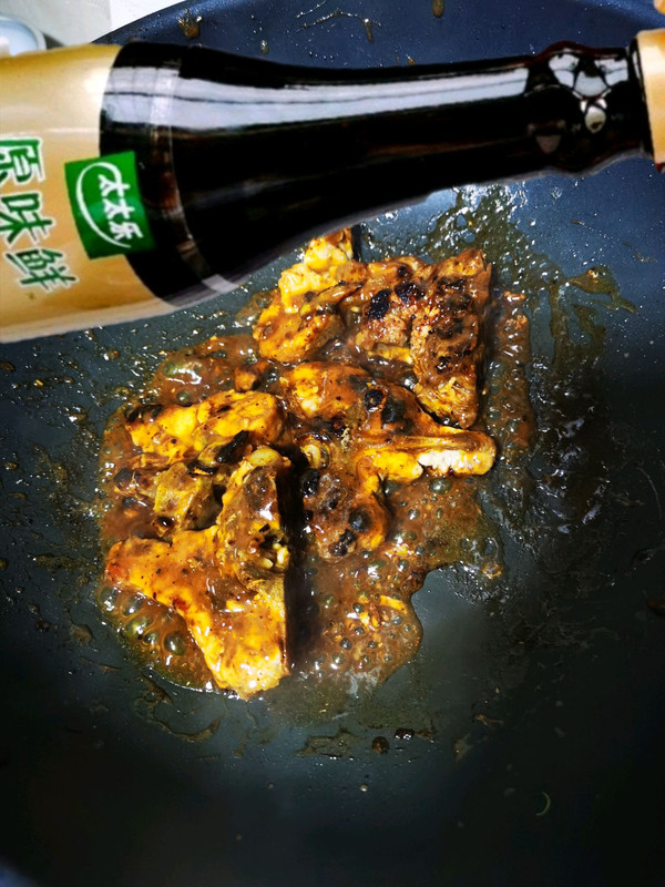 加入太太乐原味鲜头等生抽3勺老抽一勺、料酒2勺,再次搅拌均匀(选择太太乐原味鲜头等生抽来焖,是因为它零添加,3重鲜,可以深层的唤醒食物的鲜味,将鲜味体现得淋漓尽致!)