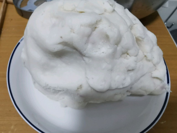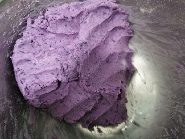 紫薯捣碎,加入适量糯米粉(我加了60克)和牛奶(目的是为了让紫薯不太干)