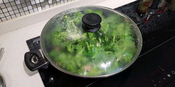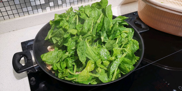 把蒜末撒在豌豆尖上,这就是银蒜,因为不是煸炒熟的,是靠锅内蒸汽蒸熟的,香味最终和金蒜不同,两者结合,口感层次好,营养价值也提升不少
