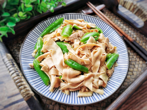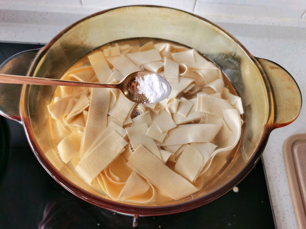 这一步就是决定干豆腐软嫩的关键了,锅中加入冷水,放入干豆腐,开火烧开后焯烫3分钟左右,加入少许小苏打,继续焯烫30秒左右,将干豆腐捞出,并用凉水冲洗。