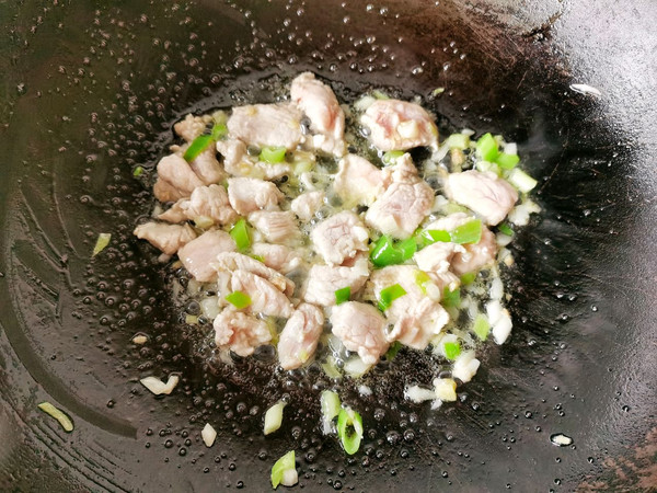 锅内加少许油,油热后加入猪肉翻炒至变色,放入全部的葱姜和一半的蒜末,炒出香味,留一半蒜末待会儿会用到。