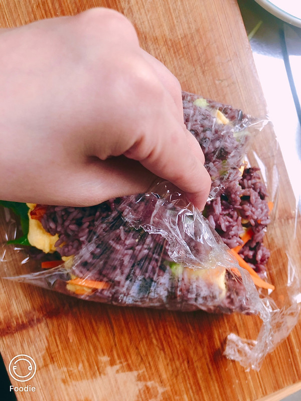菜板上铺上保鲜膜,铺上米饭,铺的越薄越好