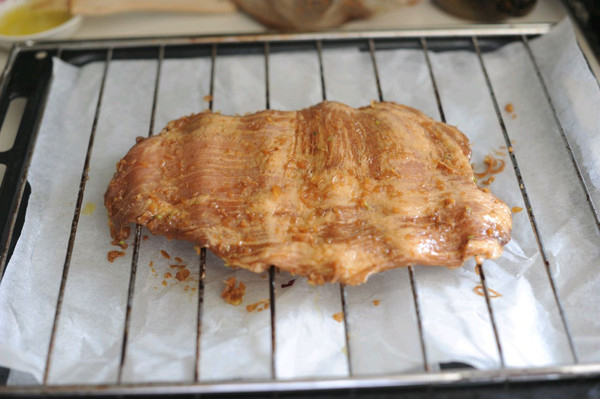 烤盘中铺上烘焙纸,放上烤架。记得一定要铺烘焙纸或锡箔纸,不然烤盘就再见了。