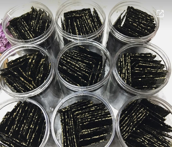 放凉的糖浆均匀扫到海苔上,边角要均匀
