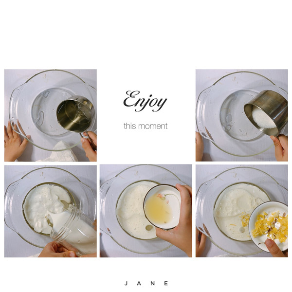 02 将葵花籽油、砂糖、牛奶、柠檬汁、1/4个柠檬皮混合一起,搅拌均匀。