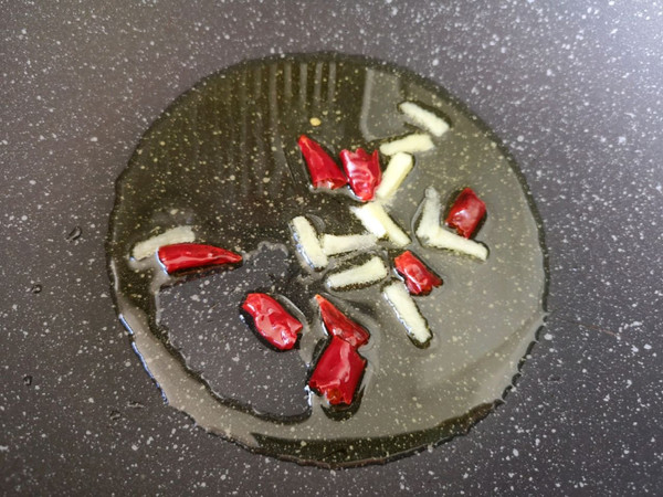 炒锅内倒适量的食用油烧热,下入姜丝和干红辣椒炒香。