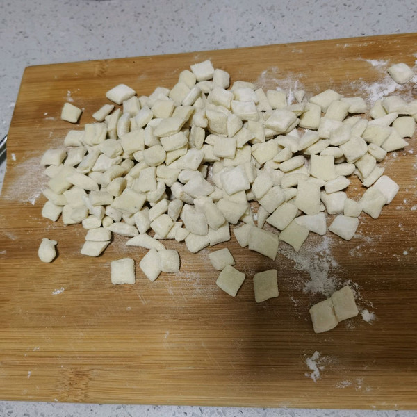 擀成差不多0.5厘米厚,切成疙瘩。可以多撒点面粉防止粘连。疙瘩建议不要切太大,会不好煮熟