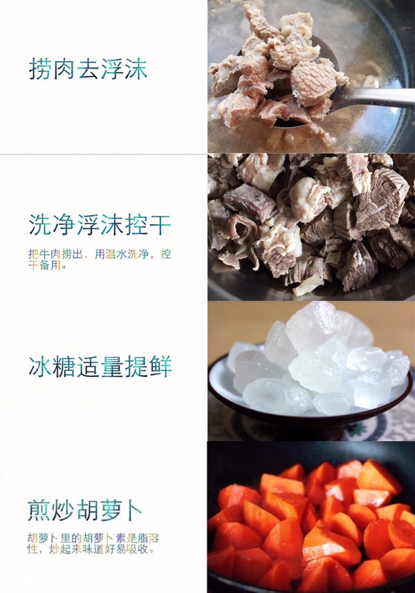 牛腩洗净切成3厘米见方的块 用水泡一个小时 捞出泡好的牛肉放进锅里,加凉水没过牛肉 开火至水开,去掉浮沫,把牛肉捞出,用温水洗净,控干备用