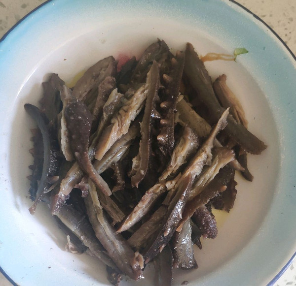 把即食海参切条,用水焯30秒(这步很重要,即食海参本身比较咸)。
