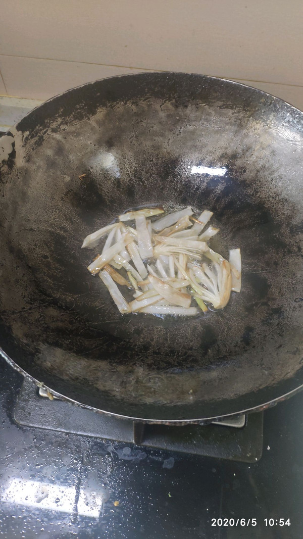 接着放入切好呢葱白煎制金黄色捞出备用。