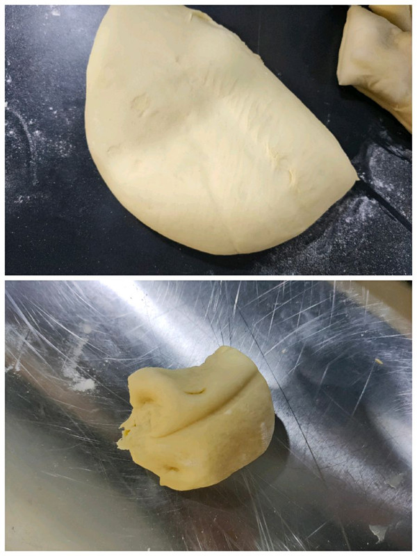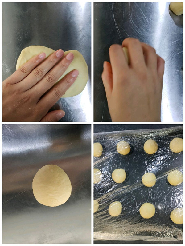 ☞桌案无粉,逐一取剂子,光面朝上,手粘粉将之拍打扁,手掌呈半握状拍之于桌面,边顺时针绕圈边借掌腹与五指同时用力收拢诸边于底部藏好以成平滑圆团,等距摆放于烤盘,封包面纸,因目前为夏季,室温静置松弛20分钟左右即可(若室温过高则送入冷藏,以防过快发酵)☜
