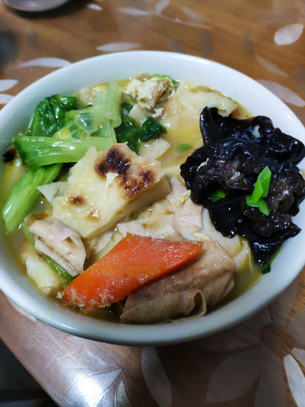 水开后,放入饼,木耳,生菜,豆皮儿。再放入盐,鸡精,香油调味儿。撒上香菜末或者香葱末。
