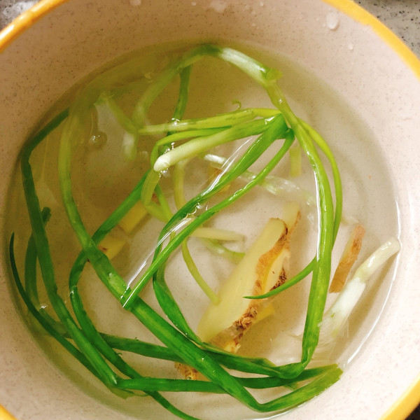 我们先把葱姜放入矿泉水中,多捏几下,把葱姜汁都捏出来